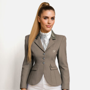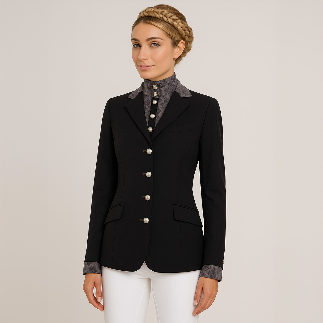 Ontdek het elegante kort zwart rijjasje met strik en kant, een perfecte combinatie van stijl, comfort en functionaliteit voor ruiters die er verzorgd uit willen zien tijdens wedstrijden en trainingen. Dit jasje is gemaakt van hoogwaardig stretchmateriaal, waardoor het niet alleen lichtgewicht en ademend is, maar ook optimale bewegingsvrijheid biedt tijdens het rijden. De subtiele lichte glans geeft het jasje een luxe uitstraling zonder overdreven te zijn.