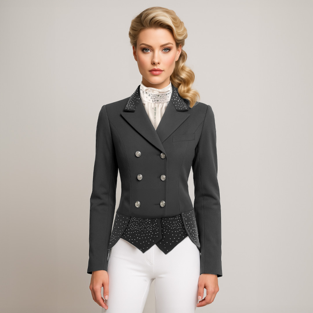 Antracietkleurige dressuurjas met korte slippen van Couture Hippique. Kristallen details, stretchmateriaal en ademende voering. Perfect voor basis- en subtop dressuur.